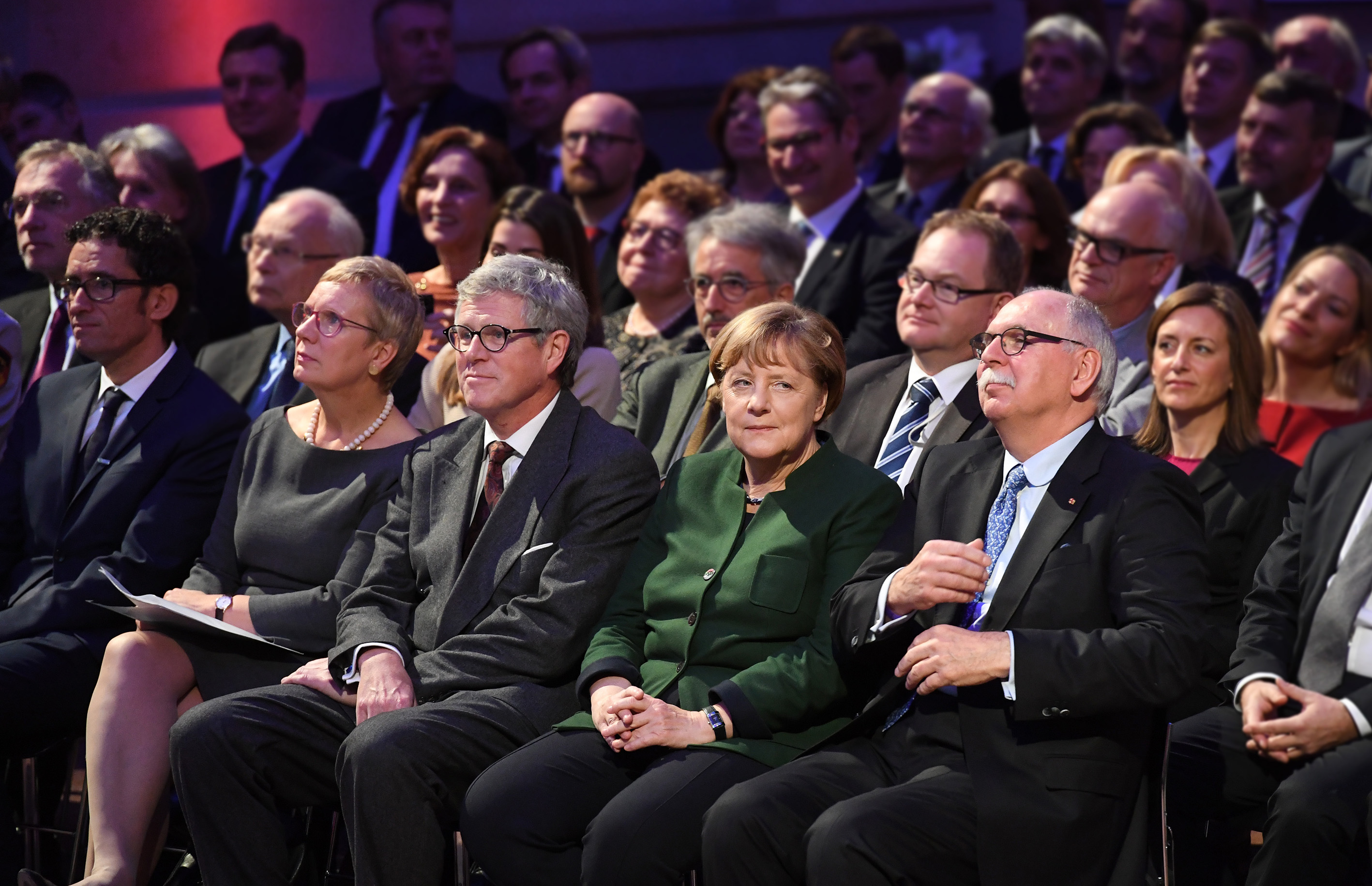 Dr. Cesar Muñoz-Fontela, Heinrich-Pette-Institut, Leibniz-Institut für Experimentelle Virologie, Hamburg, Träger des Wissenschaftspreises des Stifterverbandes "Gesellschaft braucht Wissenschaft", Senatorin Prof. Dr. Eva Quante-Brandt, Prof. Dr. Andreas Schlüter, Generalsekretär des Stifterverbandes, Bundeskanzlerin Dr. Angela Merkel und Prof. Dr.-Ing. Matthias Kleiner, Präsident der Leibniz-Gemeinschaft