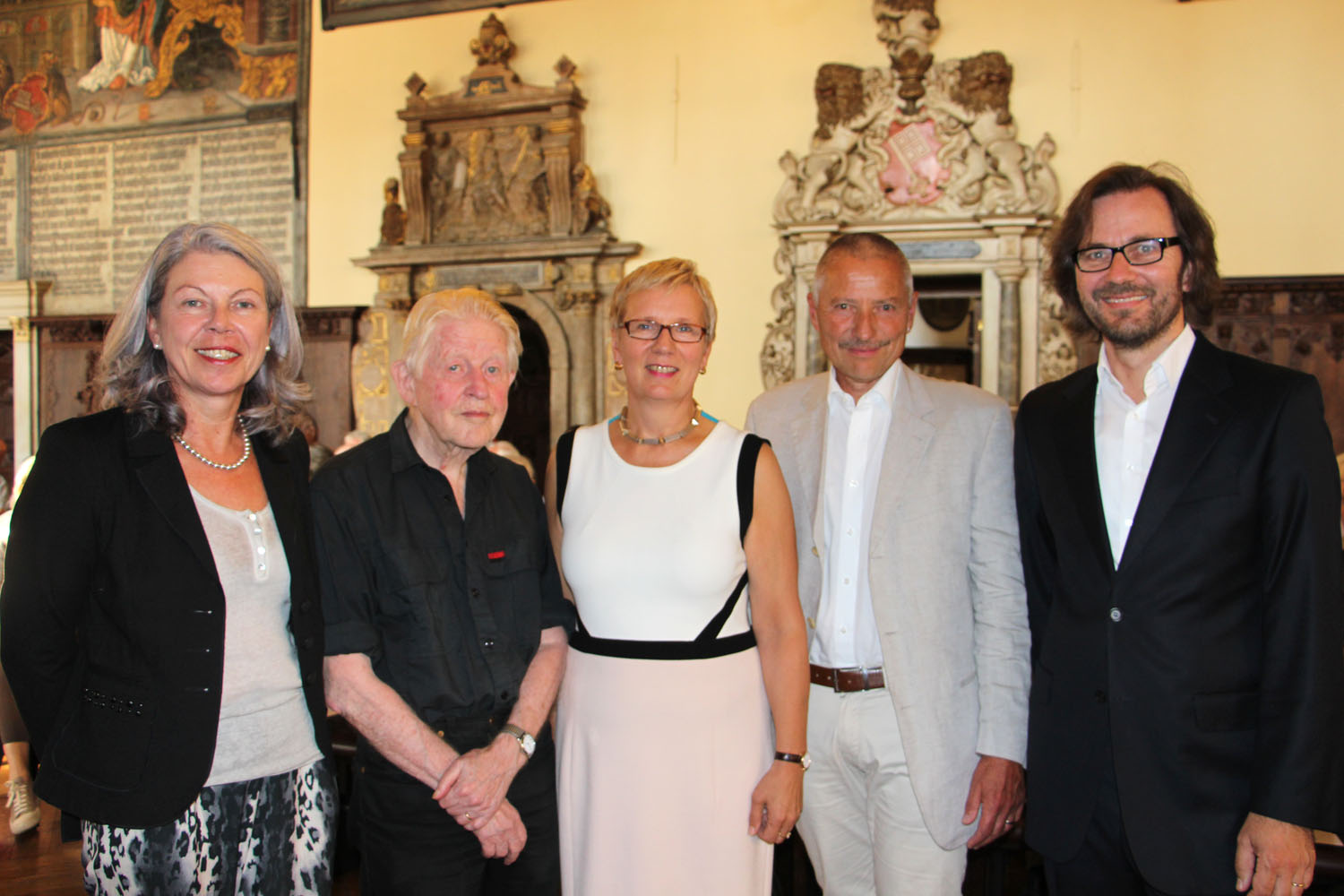 Senatorin Prof. Dr. Eva Quante-Brandt (Mi.) mit der Hauptgeschäftsführerin der Ärztekammer Bremen, Dr. Heike Delbanco, und den Referenten Prof. Dr. Klaus Dörner und Dr. Michael Wunder sowie Prof. Dr. Uwe Gonther (AMEOS Klinikum Dr. Heines Bremen) (von li. nach re.)