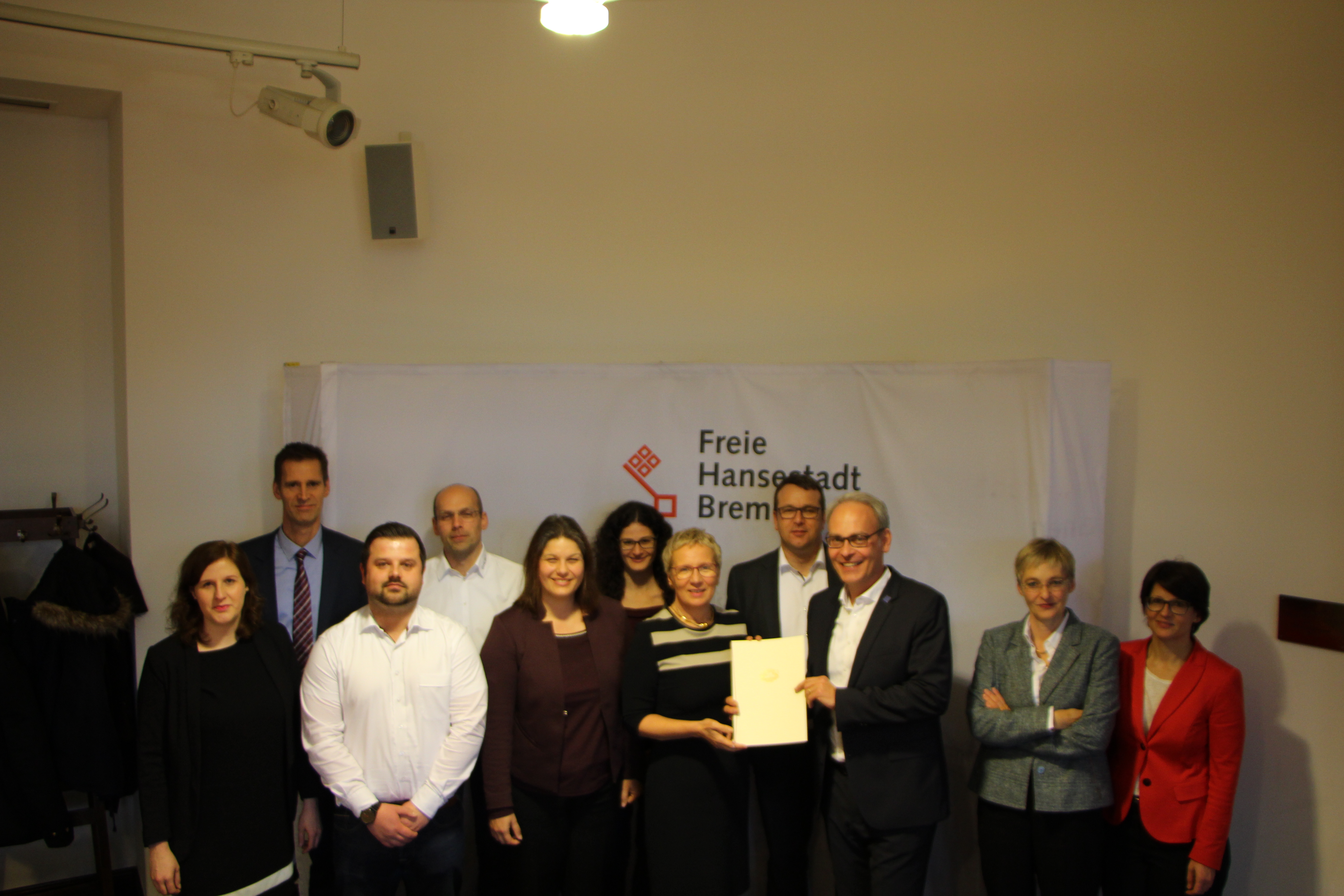 v.l. Eva Kuball, bremendigital media e.V. ; Andreas Köhler, Handelskammer Bremen; Artur Malek, 28Apps; Haye Hösel, Hubit e.K.; Annabel Oelmann, Verbraucherzentrale Bremen; Linda Mohammadi, Referatsleiterin bei der Landesdatenschutzbeauftragten, Senatorin Eva Quante-Brandt, Holger Bothmer, neusta mobile solutions; Björn Portillo, bremen digitalmedia e.V.; Dr. Imke Sommer, Landesdatenschutzbeauftragte; Gesa Wessolowski, Ressort Verbraucherschutz