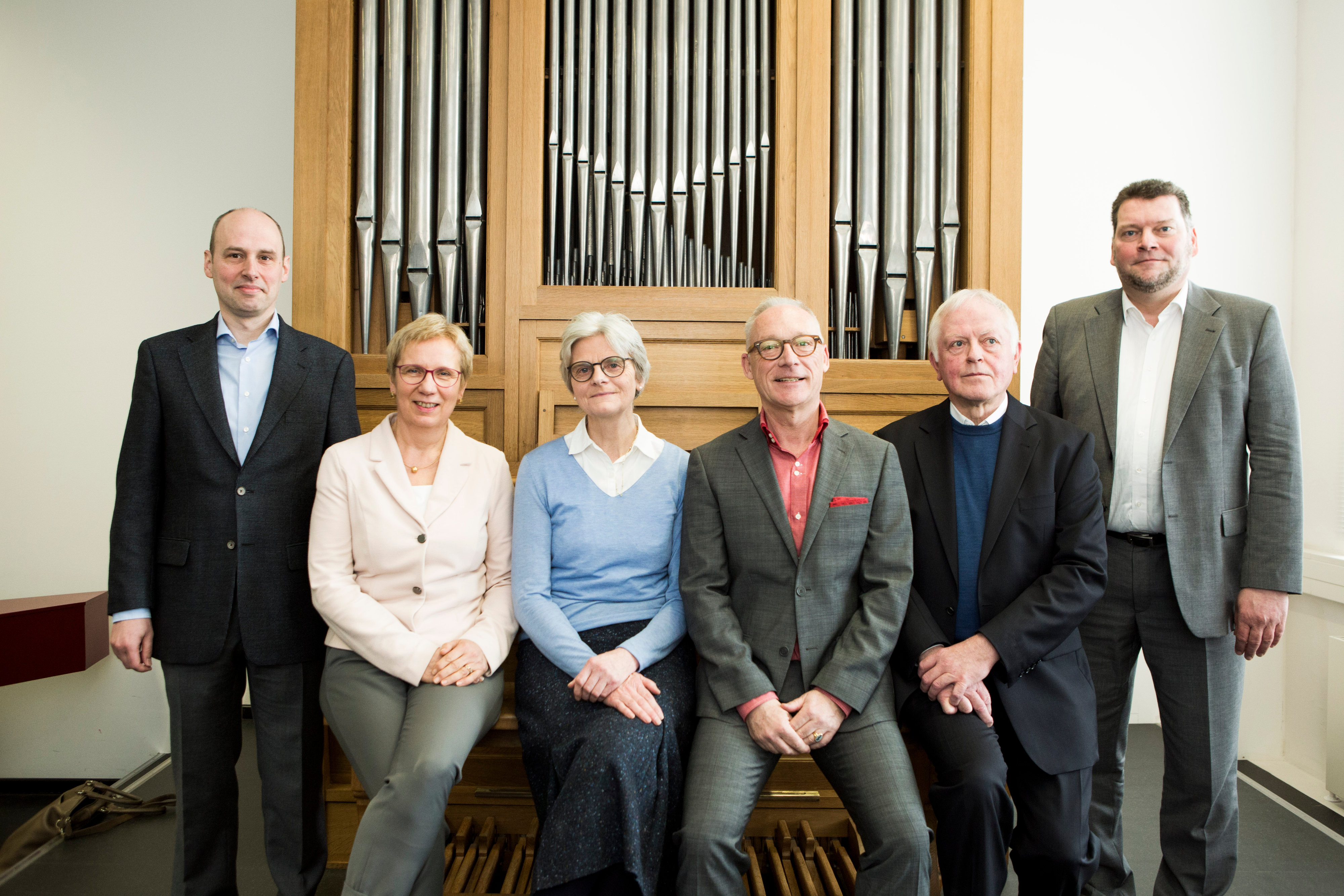 (v. l. n. r.) Prof. Kilian Schwoon (Dekan des Fachbereichs Musik an der HfK Bremen, Senatorin Eva Quante-Brandt, Edda Bosse (Präsidentin der Bremischen Evangelischen Kirche), Prof. Dr. Herbert Grüner (Rektor der Hochschule für Künste Bremen), Prof. Franz-Josef Rahe (Bischöflicher Beauftragter für Kirchenmusik im Bistum Osnabrück) und Prof. Detlef Bratschke (Professor für Ensembleleitung an der HfK Bremen)