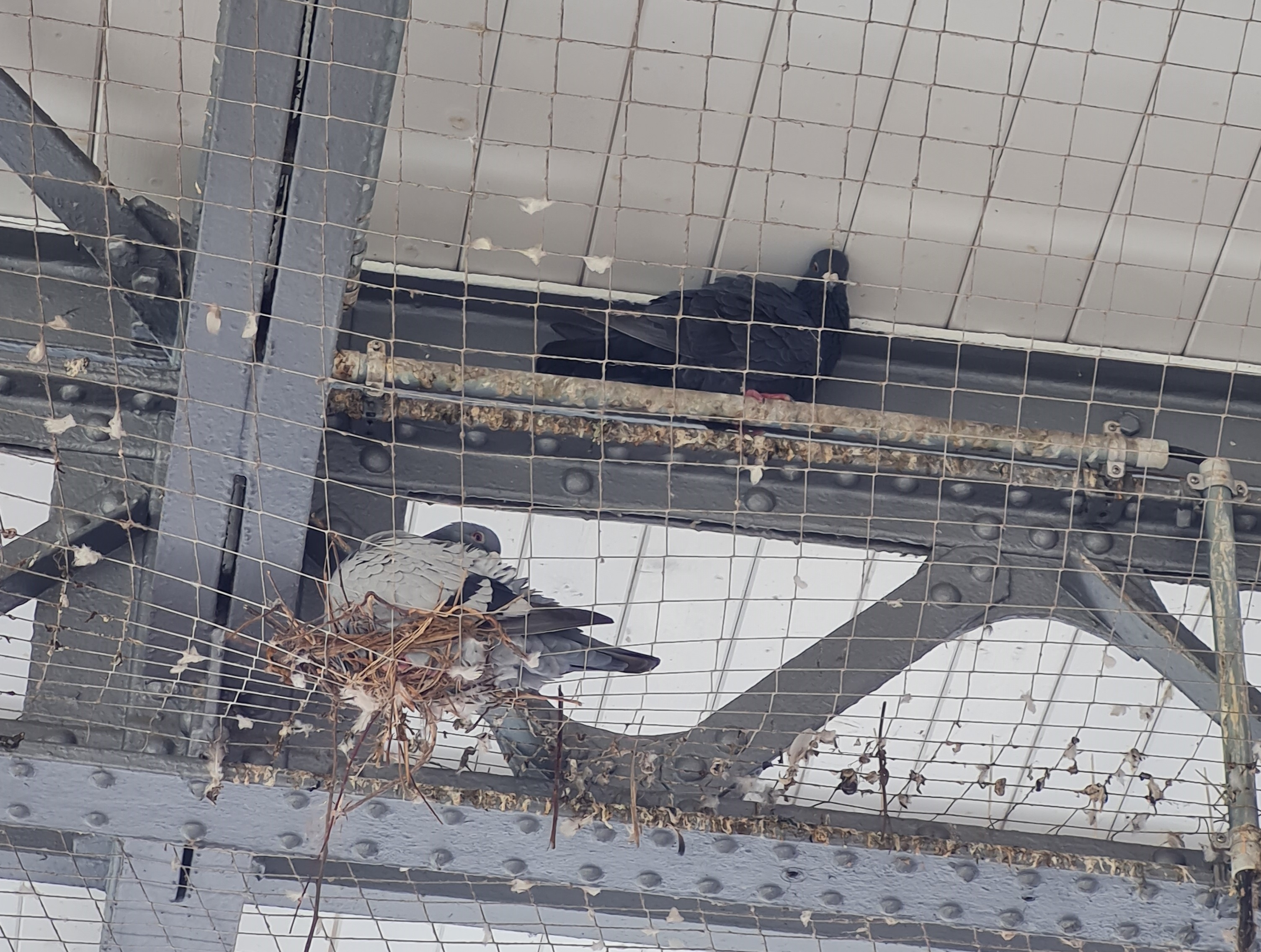 Wenn das Abwehrnetz Löcher aufweist, gelangen Tauben dahinter und nutzen die Netze dann als (für sie gefährlichen) Brutplatz
