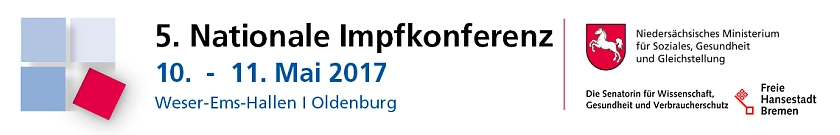 Am 10. und 11. Mai 2017 veranstalten die Bundesländer Niedersachsen und Bremen die 5. Nationale Impfkonferenz in den Weser-Ems-Hallen in Oldenburg. Sie steht unter dem Motto "Impfen in unterschiedlichen Lebenswelten – Gemeinsam Impflücken schließen!". Die zweitägige Veranstaltung bietet allen Akteurinnen und Akteuren des Impfwesens ein Forum, sich über die bestehenden Rahmenbedingungen auszutauschen, sie kritisch zu beleuchten und im gemeinsamen Austausch zu deren nachhaltiger Verbesserung beizutragen. Mit neuen und praxisorientierten Lösungsansätzen sollen noch mehr Menschen erreicht werden, damit sie von einem Impfschutz profitieren können.