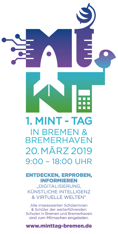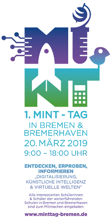 Um die Bedeutung der MINT-Fächer für das tägliche Leben deutlich zu machen und die Neugier für diesen Bereich zu wecken, findet am Mittwoch, 20. März 2019, von 9 Uhr bis 18 Uhr der 1. MINT-Tag in Bremen und Bremerhaven statt. Eingeladen sind Schülerinnen und Schüler sowie Lehrerinnen und Lehrer aus weiterführenden Schulen.